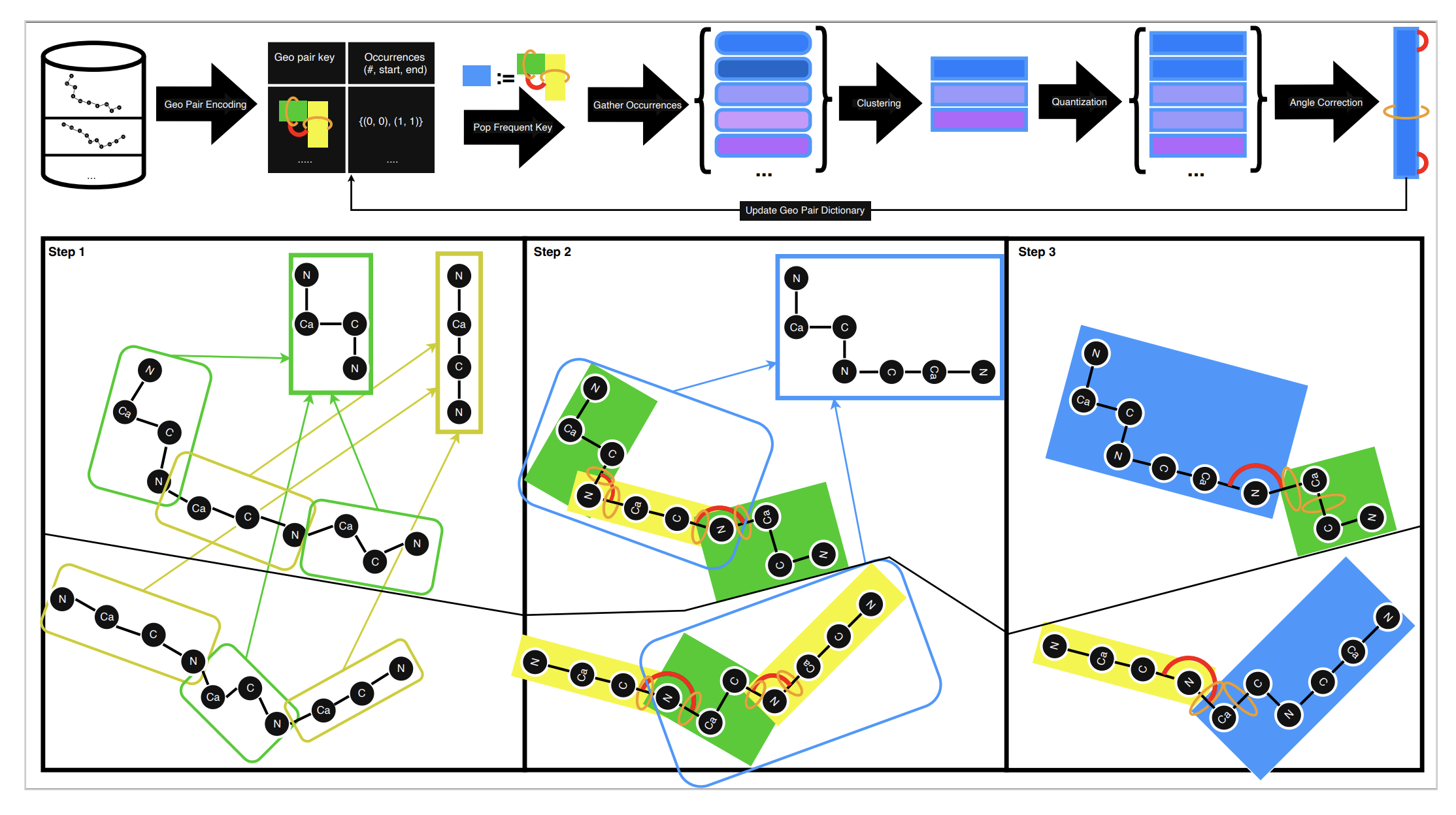 GeoBPE addresses this gap by extending byte-pair encoding to continuous protein geometry. It alternates between local motif merging and global geometric correction.