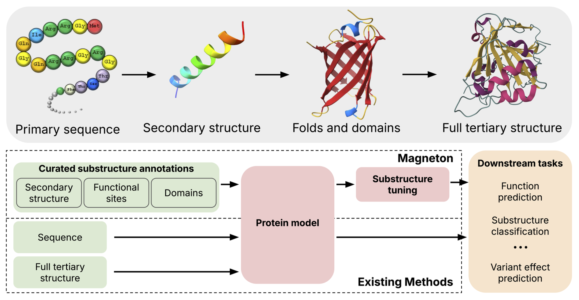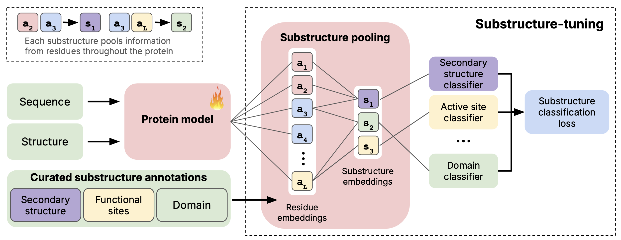 Across state-of-the-art sequence- and structure-based models, substructure-tuning improves function prediction, yields more consistent representations of substructure types never observed during tuning, and shows that substructural supervision provides information that is complementary to global structure inputs. The Magneton environment, datasets, and substructure-tuned models are all openly available