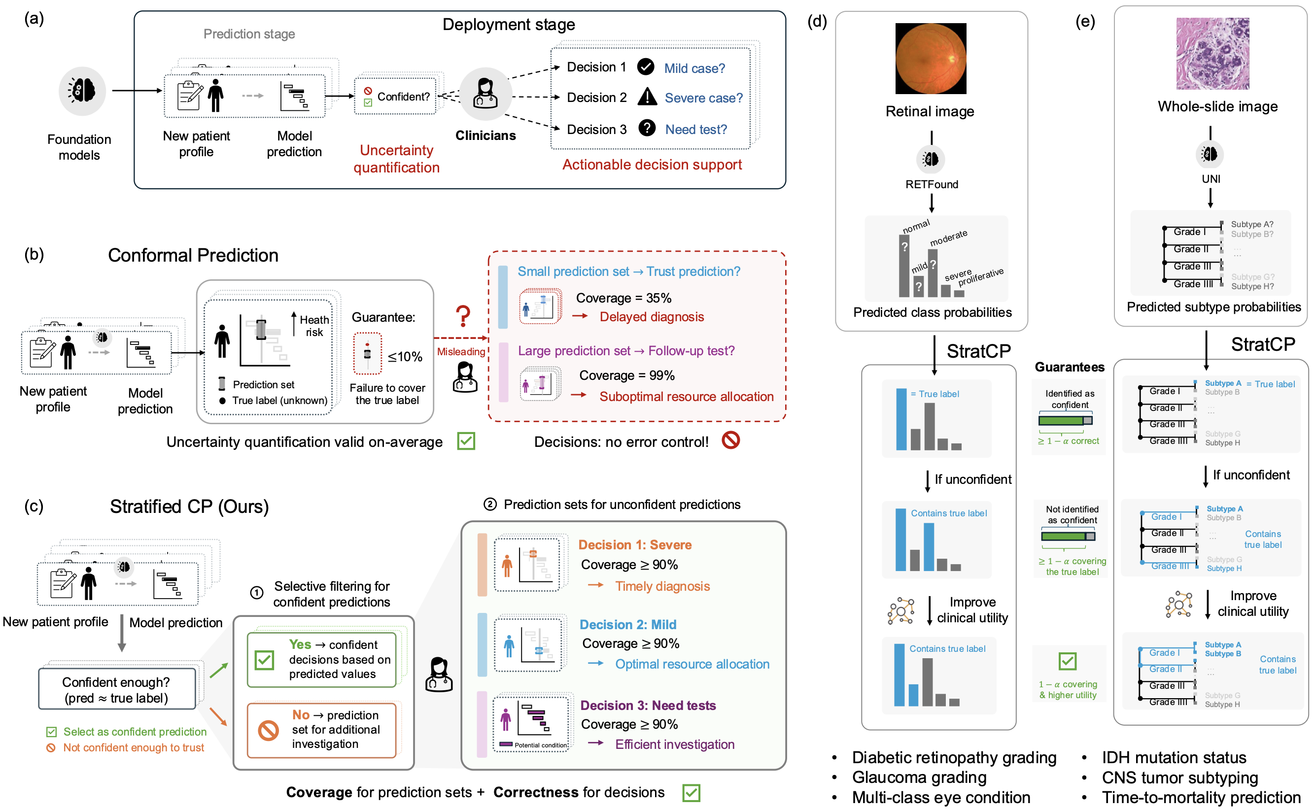 StratCP builds on conformal prediction, a widely used approach for uncertainty quantification. Given a specified error tolerance, such as 5%, and a set of new patients, StratCP proceeds in two steps. First, it selects cases where the model prediction can be used for an immediate call, while keeping the error rate among these acted-upon cases below the pre-specified budget (for example, fewer than 5% of selected predictions are incorrect). Second, for cases not selected for an immediate call, StratCP returns a prediction set of plausible labels, such as normal, mild, with a guarantee that the true disease status lies in the set for 95% of deferred patients (see Methods for details and theoretical guarantees).