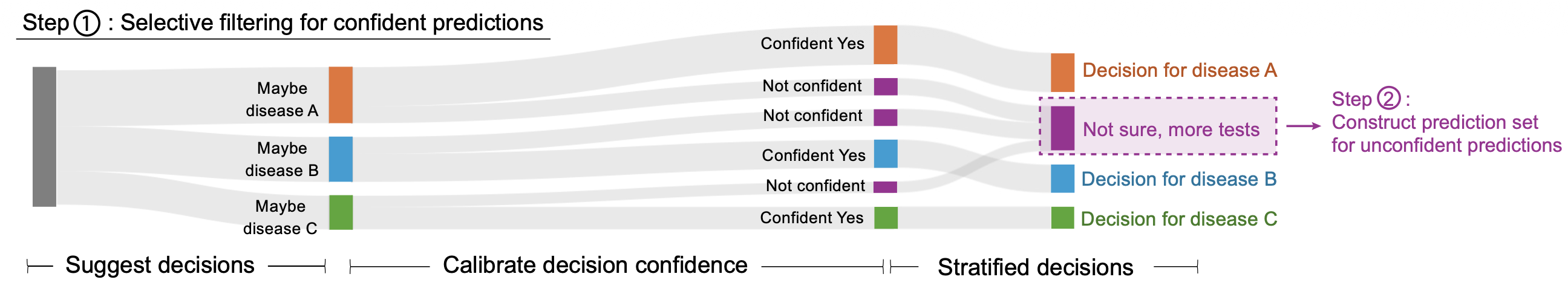 Step 1: Select confident predictions under an error budget: StratCP turns the model output into candidate decisions, such as assigning a specific disease status. For each candidate diagnosis, StratCP uses expert-labeled reference data to compute a confidence measure for each new patient and sets a decision threshold by testing against the reference data. Cases whose confidence exceeds this threshold are marked as confident. These confident calls can then be used directly for decision making under the chosen error budget.