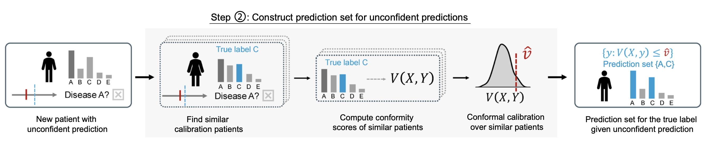 Step 2: Calibrated prediction sets for deferred cases: The second step of StratCP returns prediction sets for patients whose FM-predicted diagnoses are not confident enough for an immediate call. After Step 1, deferred cases differ from the full reference set because they are enriched for ambiguity. StratCP accounts for this shift by calibrating uncertainty using only expert-labeled cases with similar ambiguity, following recent work on post-selection conformal inference. Given an unconfident case, StratCP finds a subset of expert-diagnosed patients whose FM outputs are similarly ambiguous, using the same confidence criterion as in Step 1. It then forms a prediction set by including each candidate diagnosis for which the corresponding test statistic falls within the expected range when compared to these similarly ambiguous expert-labeled cases.