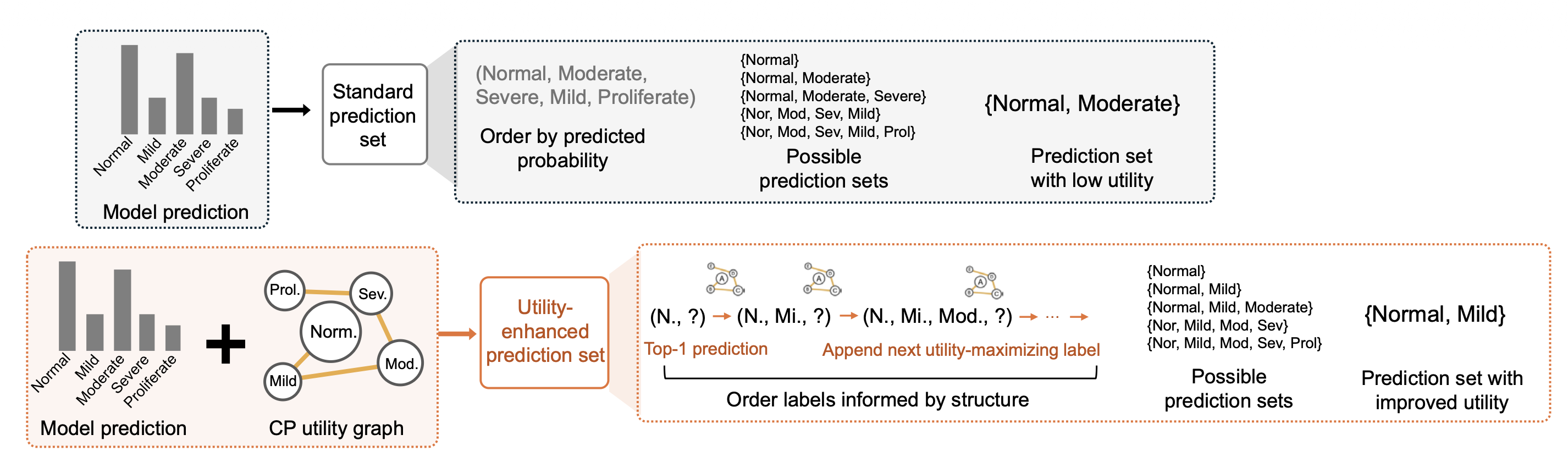 We also show that utility graphs derived from expert diagnostic guidelines can shape prediction sets without sacrificing conformal coverage. This produces differential diagnosis sets that respect clinical adjacency, such as neighboring diabetic retinopathy stages or related CNS tumor categories, and better match the follow-up actions a clinician would take.
